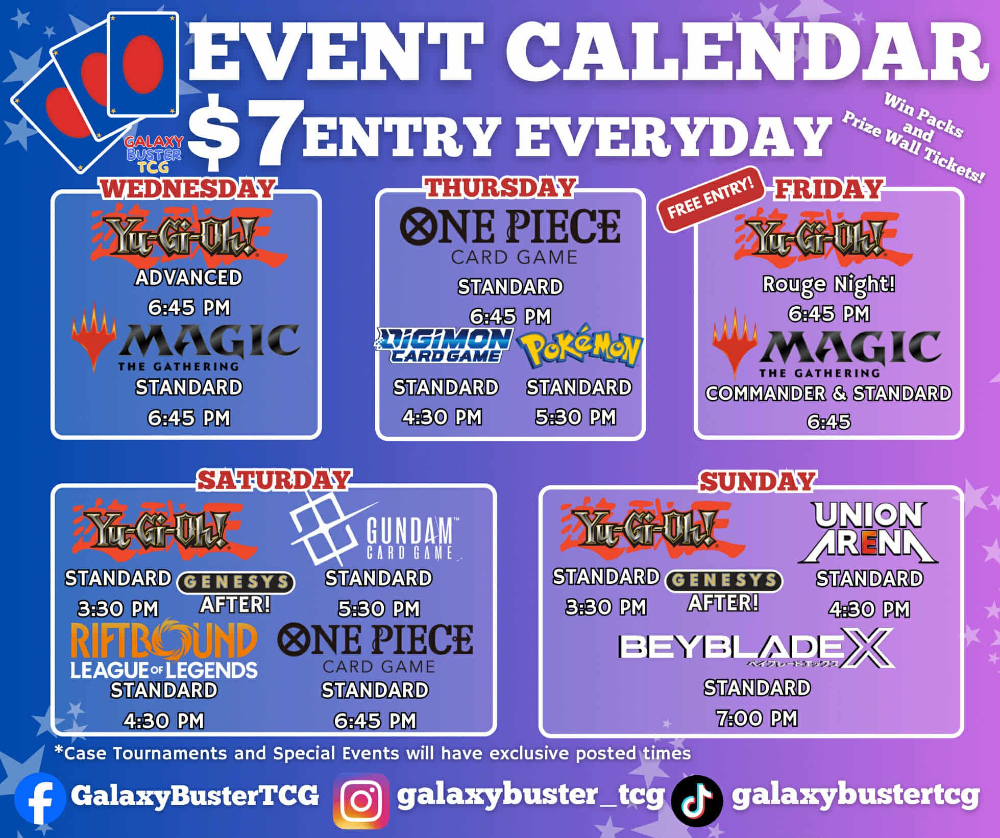 *Case Tournaments and Special Events will have exclusive posted times